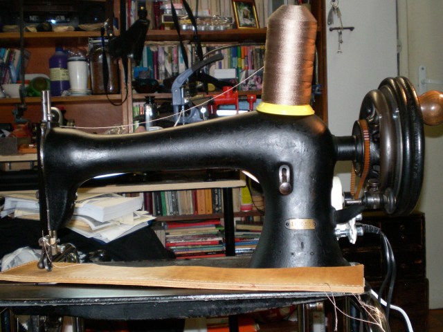 Това всъщност не е сарашка а саяджийска машина, което ще рече – машина за саЯ, на български – обувки. Тя е с едно малко колелце при иглата, което позволява да се шият лесно завоите по ръчно правените обувки…. Баш сарашката е четири пъти по-голяма, с друг механизъм и пр, трифазен мотор и т.н., но ний не семе сарачи. Въпреки това ще видите, че с малко повече ловкост шие двоен телешки бланк 6 мм, или нещо подобно – има го на снимките. намират се игли с ромбоидно заточване – много важно, и останалото е проби и практика.