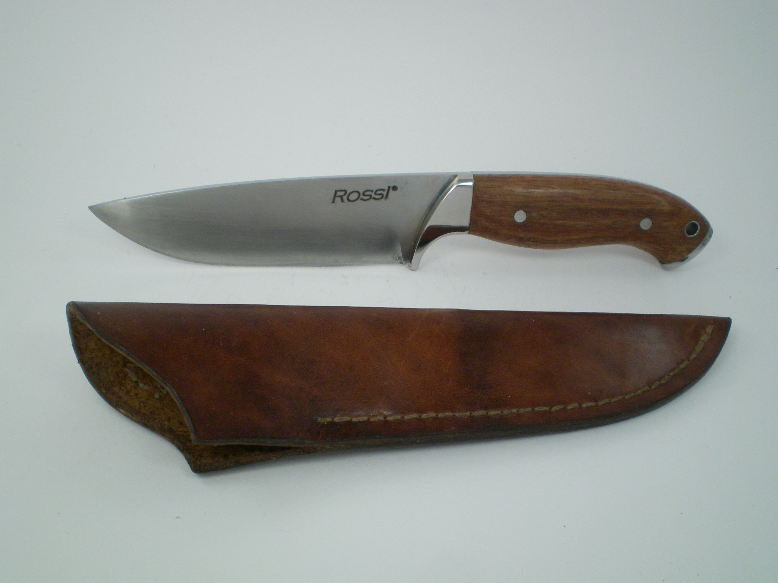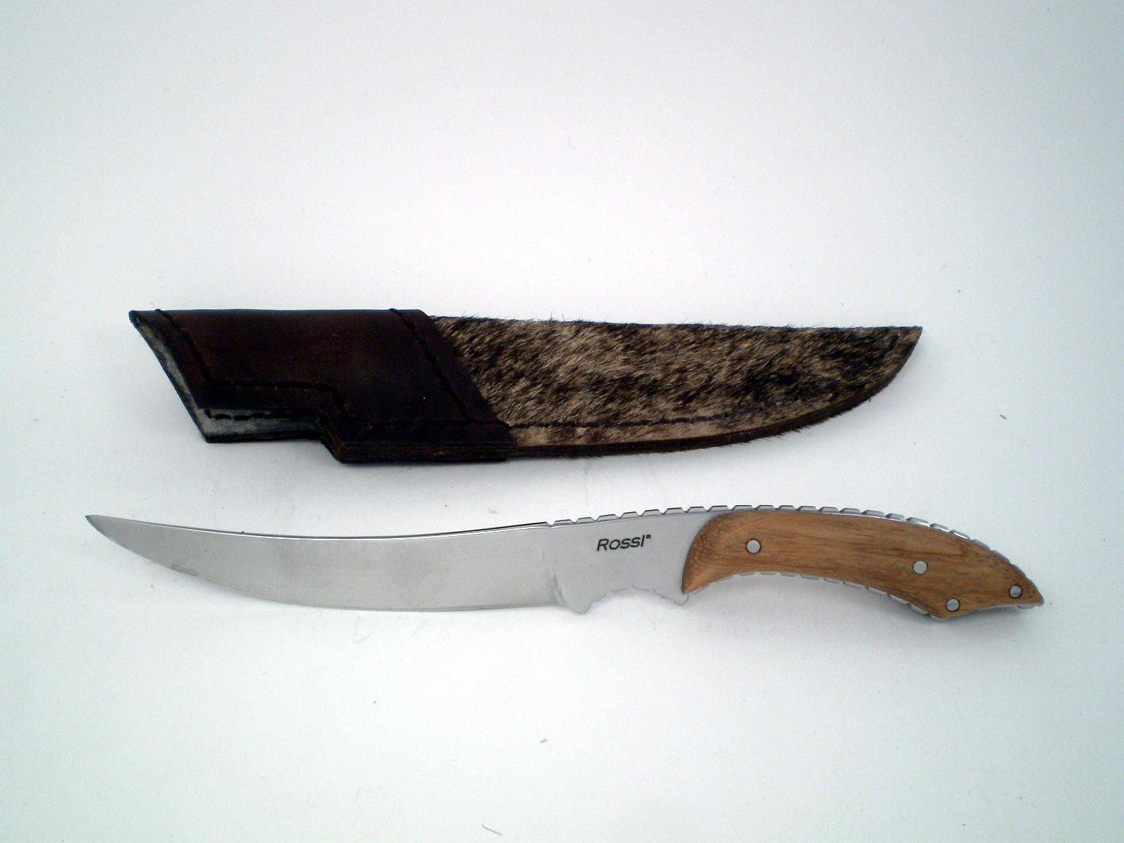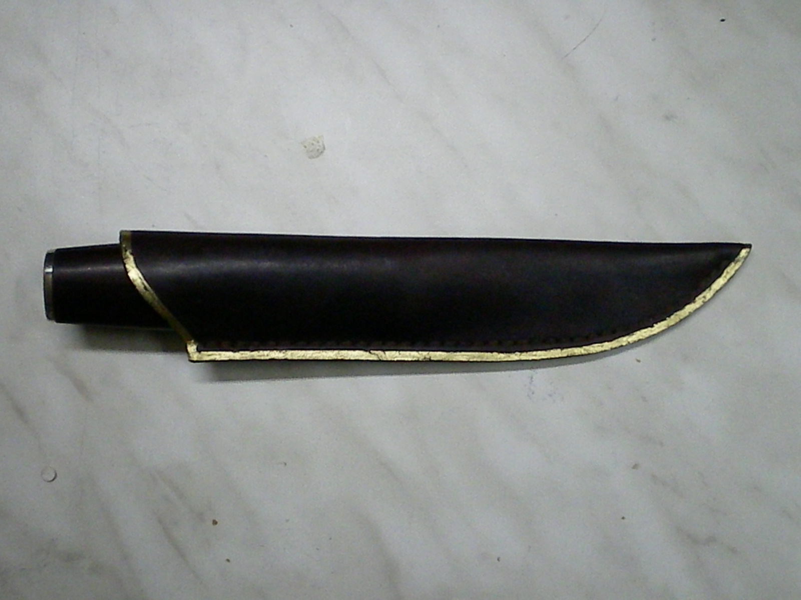 Това са двете снимки на ножа преди и сега. Това е едно класическо бауи, изглежда ужасно с тази дръжка, въпреки че е от амбойна, но дръжката е такава, защото е точна реплика на онова време. Ножът е на Сергей Ковачев, мъдрувахме с какво да я сменим, че ножът да се ползва и се спряхме на дръжка от кожени шайби. Всъщност шайбите са от качествен гьон, гардът е оригиналният, а помелът е от месинг със скрига гайка в него. Ножът стана много удобен, красив и с една идея по-тежък от нужното, но това беше очаквано. Но дръжката е здрава, надеждна и удобна и със Сергей сме доволни от свършената работа.