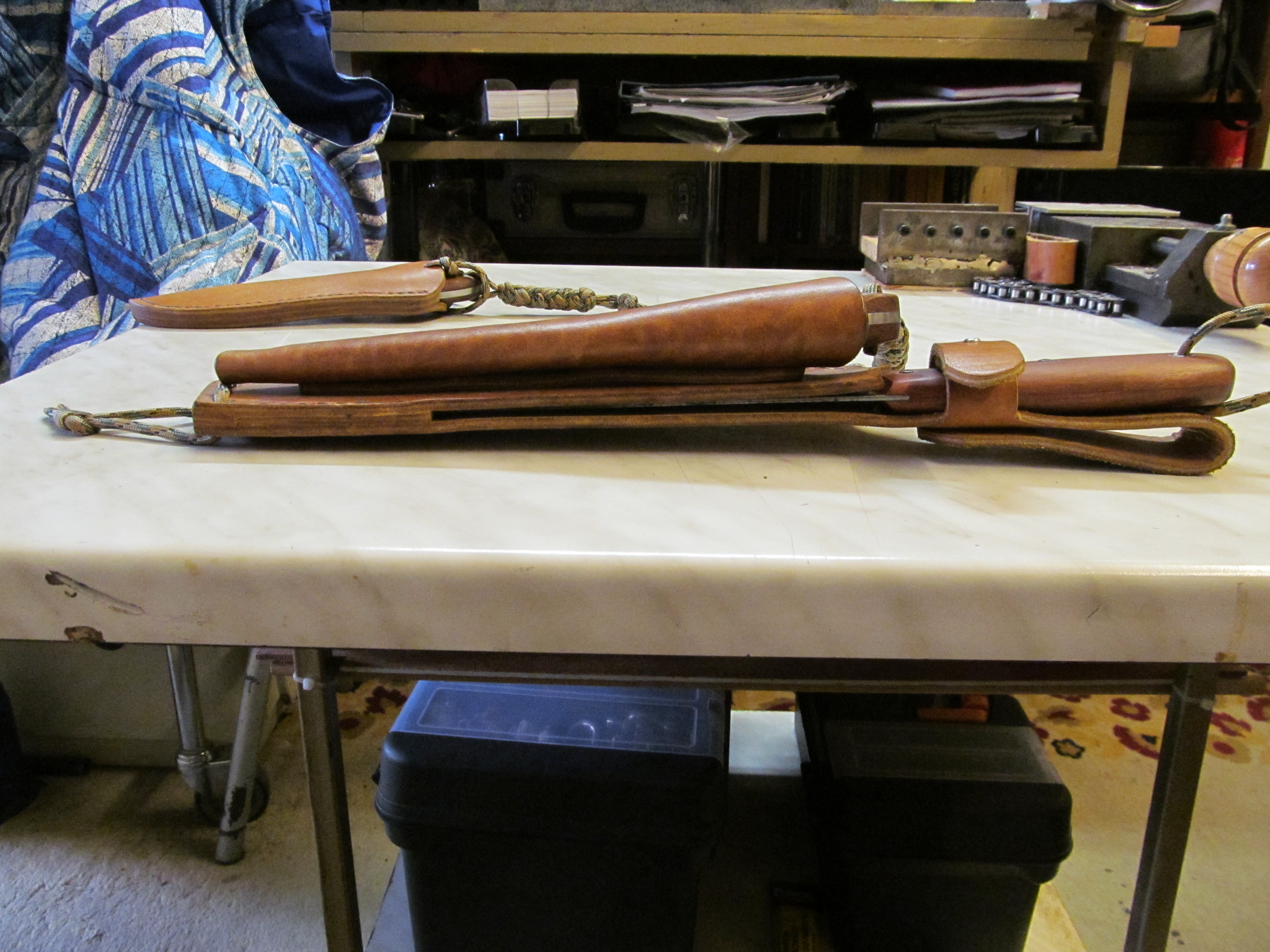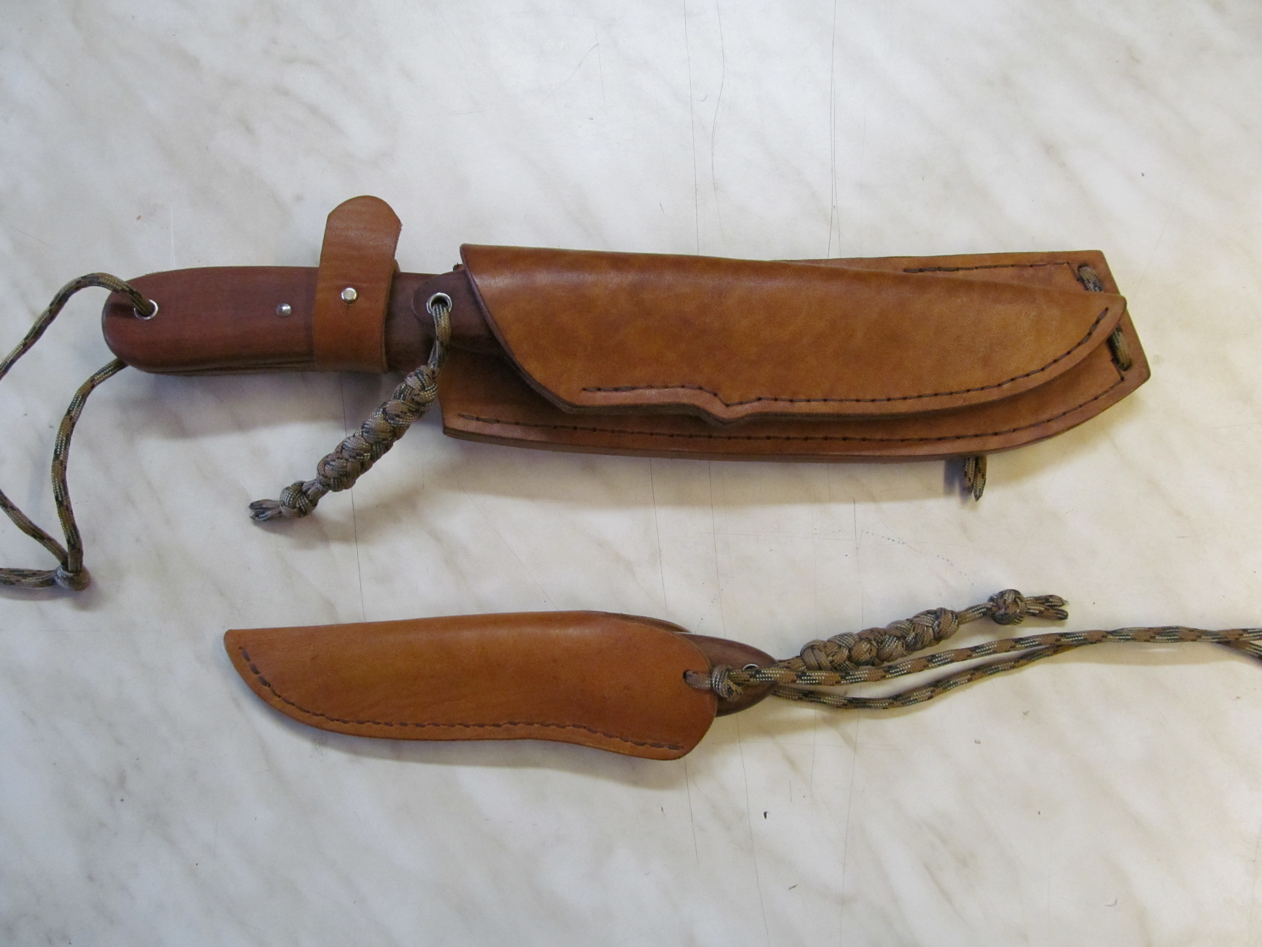 По едната милост божия притежавам изработен от майстор Гого такъв тандем от две сечива – голям нож тип мачете и малък нож от Д2. Само суперлативи мога да кажа. Използвам комплекта при полевата си работа. При правенето на трансекти през обрасли участъци използвам големия нож за да кастря подлес и ниски клони. Нося го с дръжката на долу на халката на лявата презрамка на раницата и имам лесен достъп с дясната ръка до него. В бивака или лагера го нося на колана и тогава използвам приоритетно малкия нож, който при това е конвексиран от едната страна и флат от другата, така, че когато ми се налага да правя федър стик, ножът не влиза в дълбочина на дървесината а прави много хубава стружка.