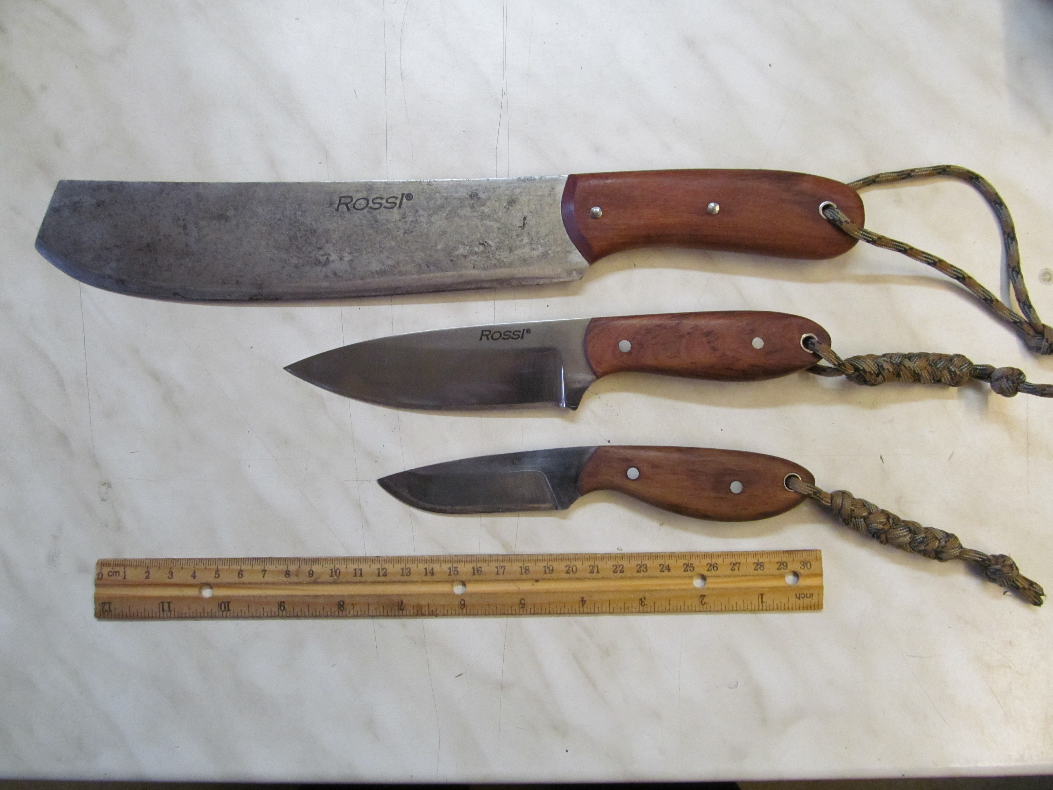 Ето ги хубавците 🙂 Голямото мачетеподобно е от горната част на старо истинско китайско мачете от добра ръждавейка, второто е лична разработка с име Флагман 2 – също от ръждавейка О2 и третото е едно старо ножче, малко модифицирано, също от стомана О2.