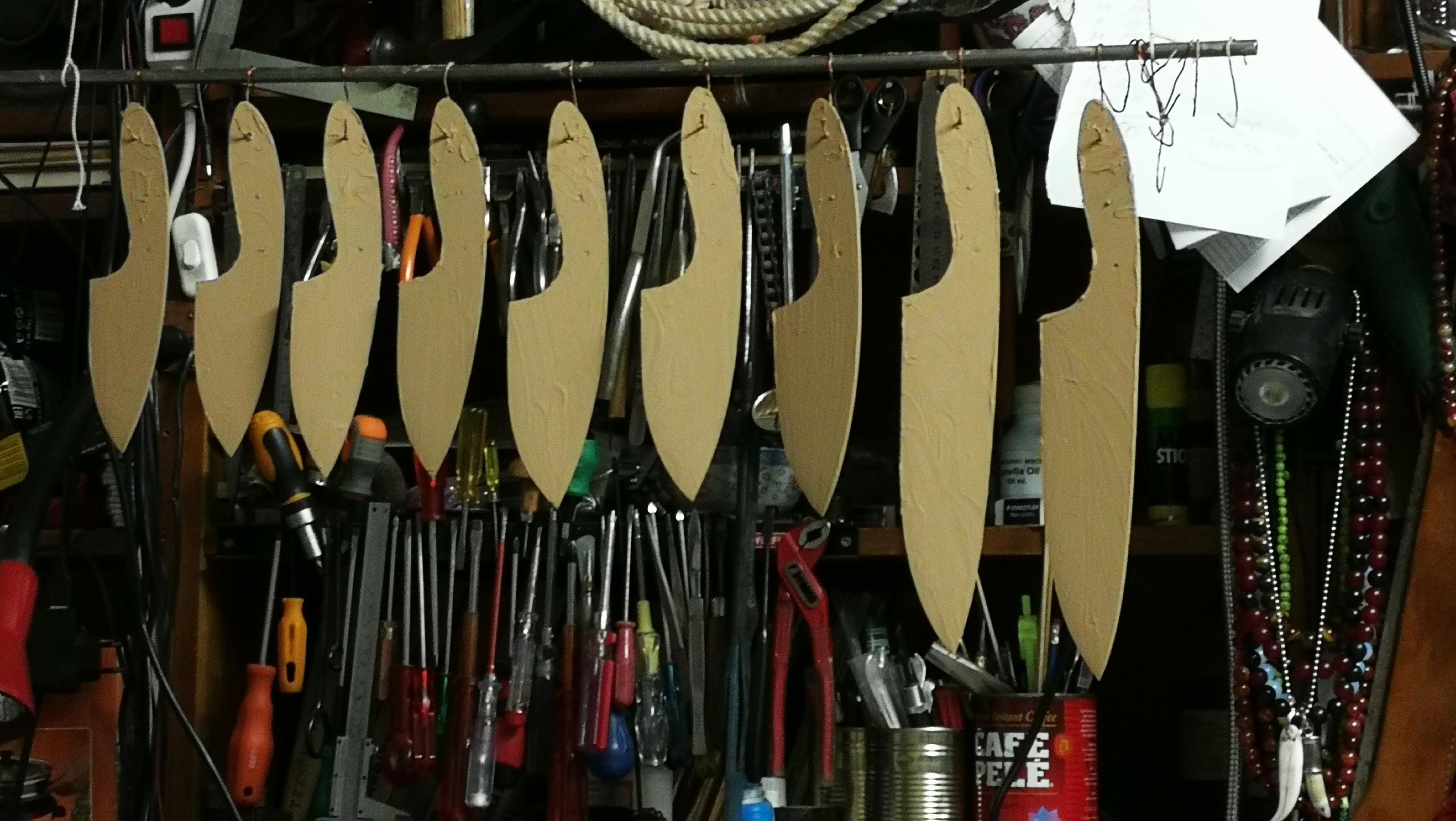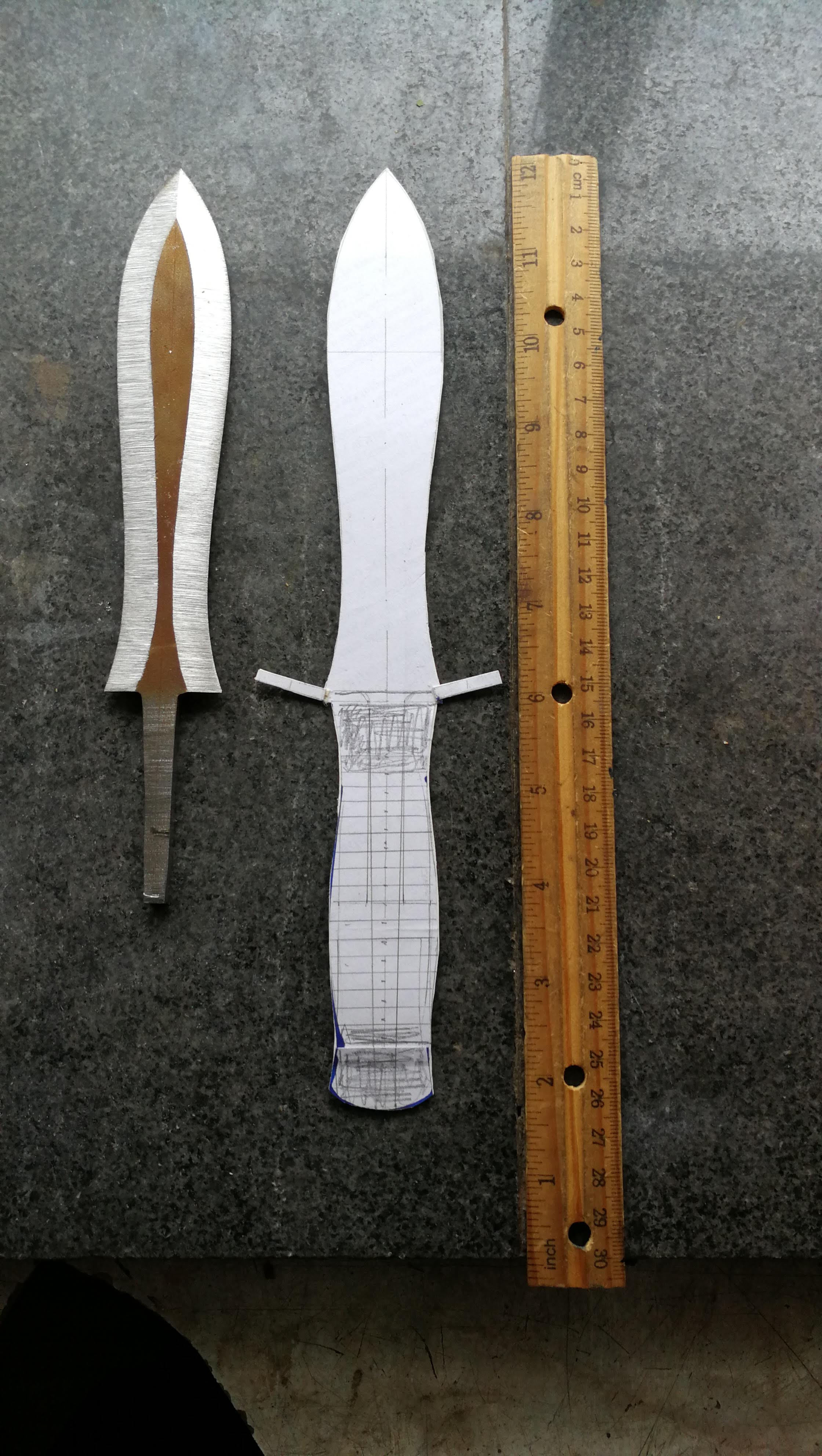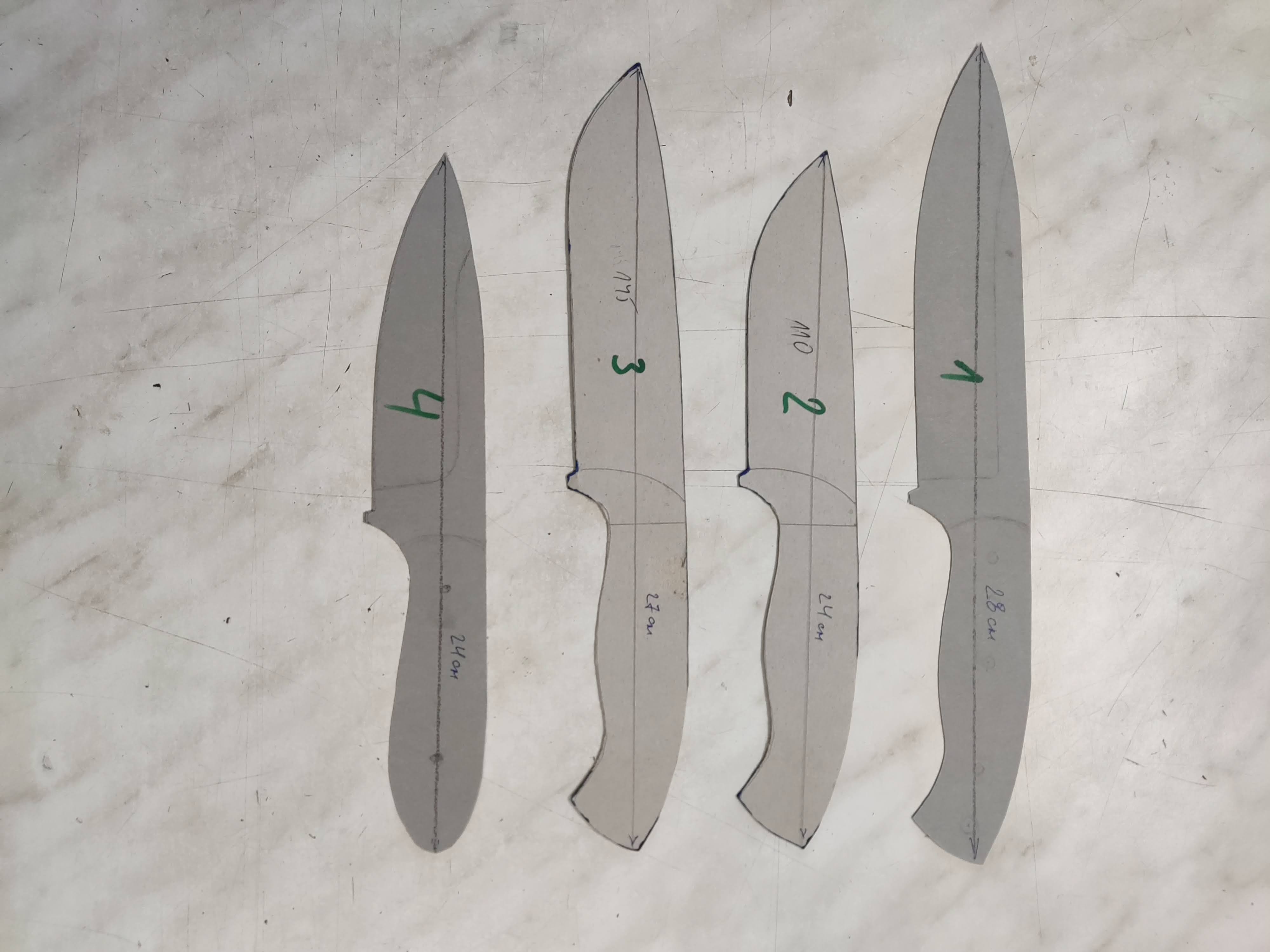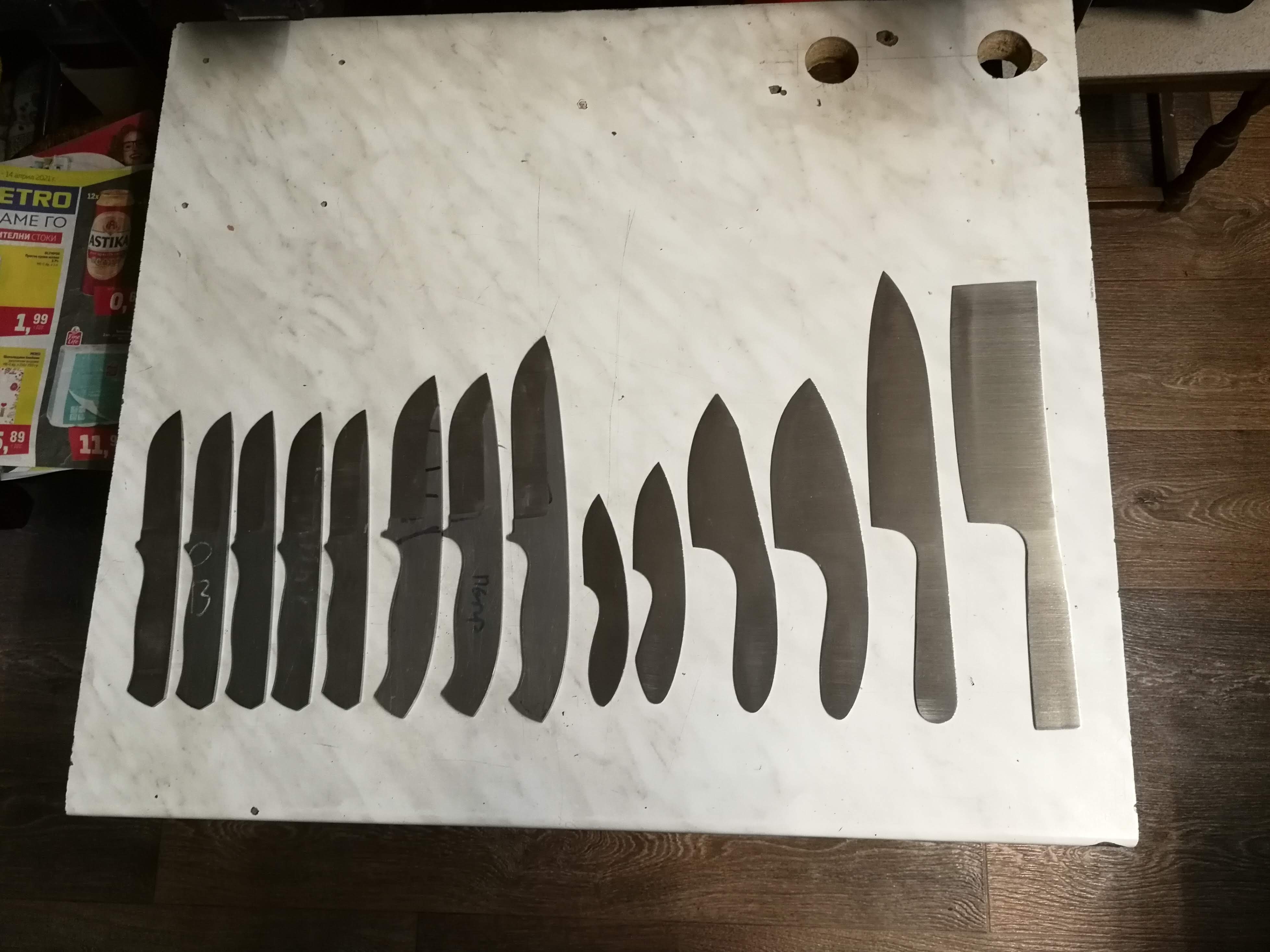 Следват малко заготовки за моя Флагман 1 – в три размера – малък, среден и голям; понеже имах застояли стомани – взех че дадох да ми ги нарежат на лазер, но този път само малък и голям, както и Флагман 2 – малък и голям /големият е чисто нов – не съм го изработвал, имам само заготовките – но този е от стомана О2 – за знаещите 😉 / – на снимката с четири вертикални картонени номерирани моделчета – това са: 1 – новият голям Флагман 2, 2 – малкият Флагман 1, 3 – големият Флагман 1, 4 – малкият Флагман 2 😉 – голям ребус 🙂