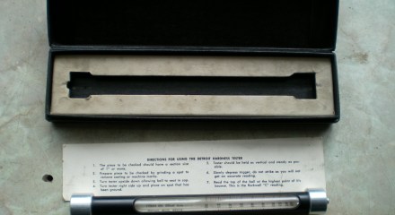 Това е един твърдомер по скалата на Рокуел – DETROIT HARDNESS TESTER. Много просто устройство – тръба със скала, един магнит в горната страна на тръбата. Като се обърна наопаки магнитът задържа топчето, уредът се фиксира върху повърхността и с едно бутонче се освобождава топчето; по височината на отскока се мери директно твърдостта. Скалата е … Има още